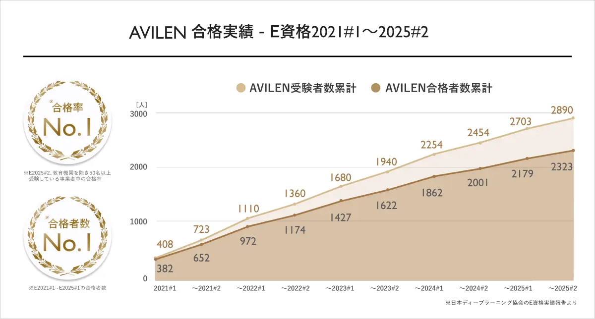 「全人類がわかるE資格講座」は、AVILENが提供するJDLA認定プログラムです。2021#1~2025#1の期間において合格者輩出数No.1(※1)、累計2,323名の合格者を輩出しています。
