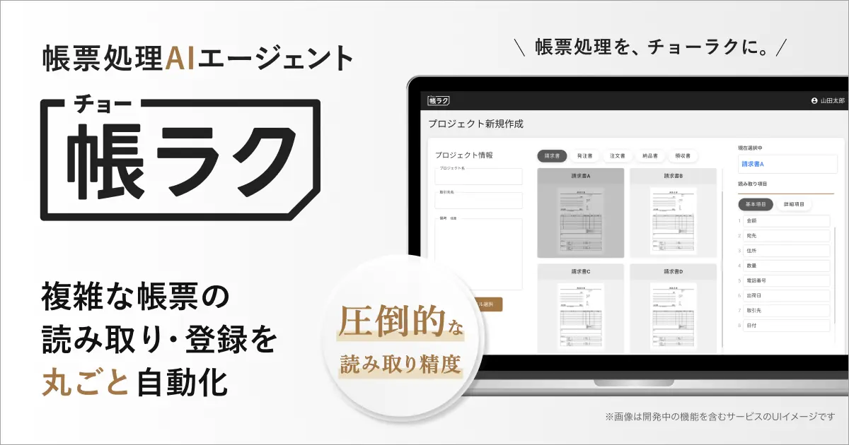「帳ラク」は請求書や発注書、見積書などの帳票をAIで読み取り、簡単な設定で業務の自動化を実現できるサービスです。